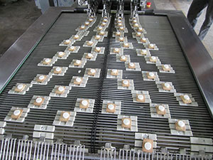 Biscuits are delivered by belt conveyor, vibratory chutes and magazine feeder. PLC and touch screen are employed for accurate control.