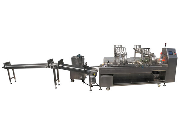 Biscuits are fed by belt conveyor, vibratory chutes and magazine feeder. PLC and touch screen control are introduced to realize precision control.